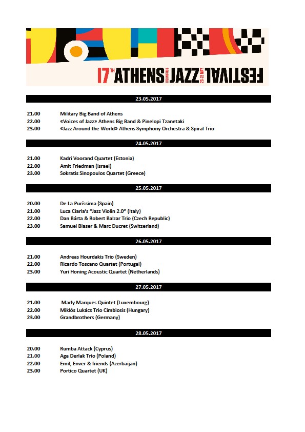 A május 23-28 között megrendezésre kerülő "17th Athens Jazz Festival" programja a következő: