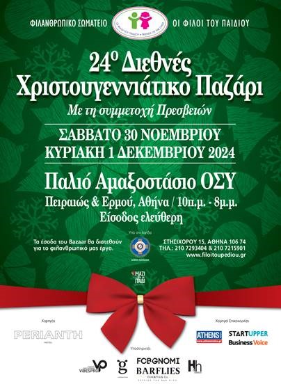 Tisztelt Honfitársaink! Idén is megnyitja kapuit a Friends of the Child jótékonysági szervezet által rendezett Karácsonyi Bazár. Az esemény, amelyen nagykövetségünk is részt vesz 2024. november 30-december 1. között kerül megrendezésre a szokásos helyszínen: Old Depot OSY (Παλιό Αμαξοστάσιο ΟΣΥ), 105 53 Piraeus és Ermou utca sarok, a Technopolis-al szemben. Standunkon magyar termékeket vásárolhatnak az érdeklődők. Szombaton (november 30.) 16 órakor pedig magyar táncokkal lép fel az ELKELAM táncegyüttes.A belépés ingyenes. Várunk mindenkit szeretettel!!