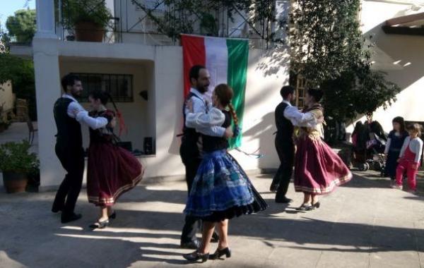 Az ünnepi megemlékezésen meghívott vendégként adott előadást az athéni ELKELAM néptánccsoport, akik évek óta a magyar néptánc görögországi népszerűsítésén fáradoznak. Nagykövetségünk kihelyezett és helyi magyar alkalmazottai, a meghívott magyar kolónia tagjaival együtt rövid műsorban mutatták be az 1848-as márciusi események főbb mozzanatait. A megjelent magyar családok kisgyermekeinek külön kézműves foglalkozást is tartottunk, a fent említett görög néptánccsoport pedig játékos keretek között mutatta meg a magyar néptánc legegyszerűbb alaplépéseit. Az ünneplést estig tartó szabadtéri összejövetel követte.