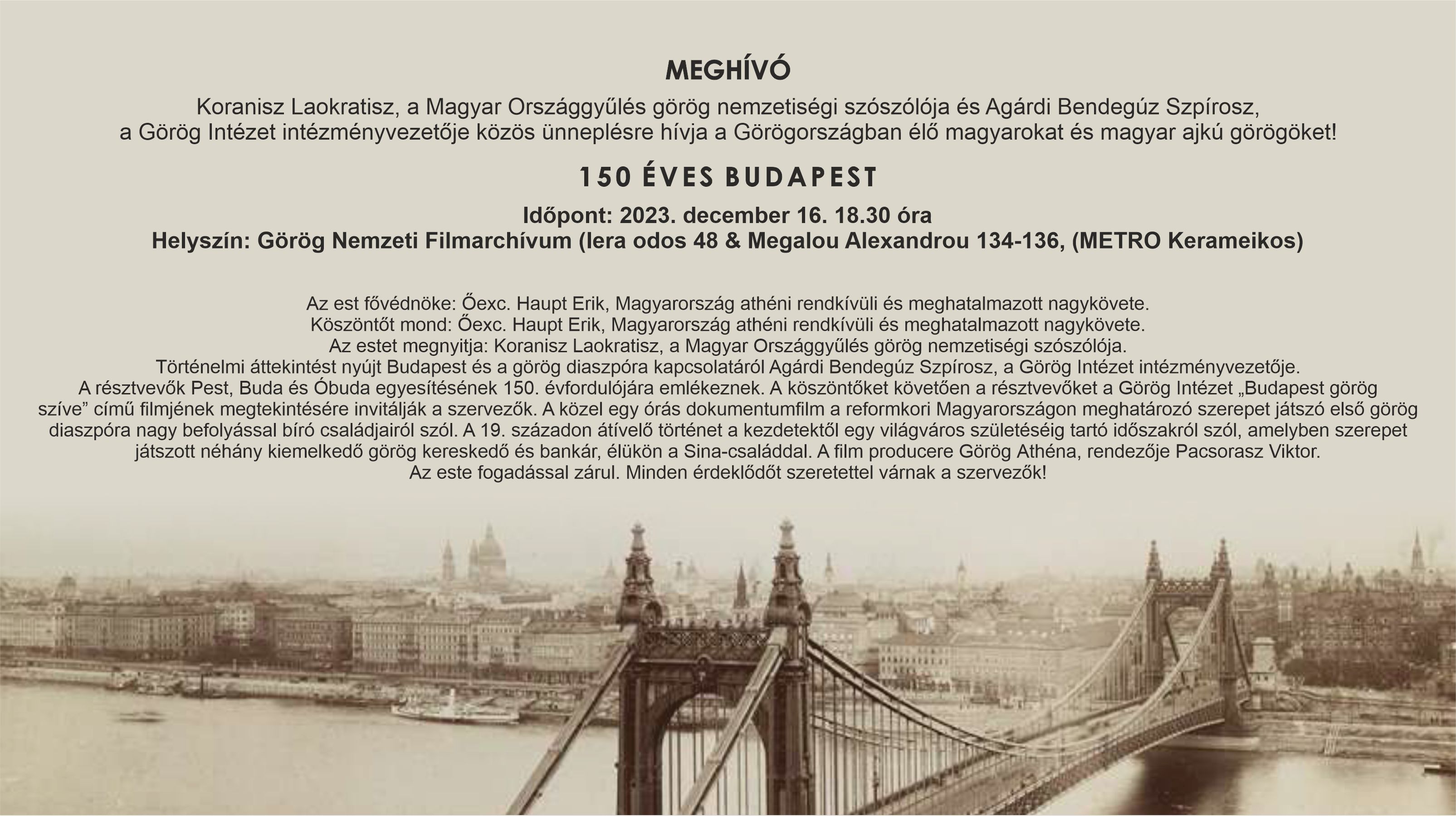 Ezúton továbbítjuk Koranisz Laokratisz, a Magyar Országgyűlés görög nemzetiségi szószólója és Agárdi Bendegúz Szpírosz, a Görög Intézet intézményvezetője közös meghívóját a 150 éves Budapest c. rendezvényre. A rendezvény helyszíne: a Görög Nemzeti Filmarchívum, időpontja 2023. december 16., 16.30. Sok szeretettel várnak minden Görögországban élő magyart és magyar ajkú görögöt is.