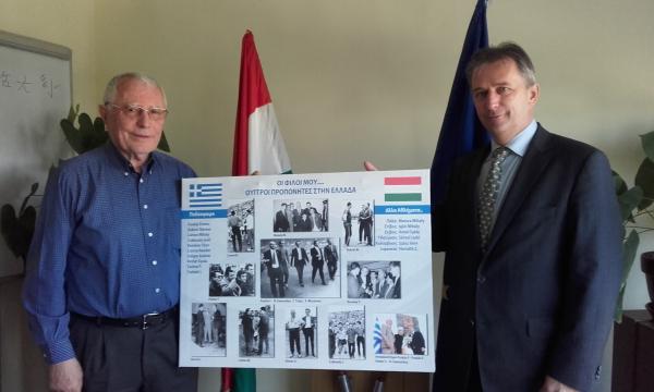 Május 22-én Nagykövetségünkre látogatott Nikosz Szakulisz úr, Puskás Ferenc egykori tolmácsa, segítője, barátja és a Panathinaikosz labdarúgó klub emblematikus alakja. Szakulisz úr - aki Öcsi bácsin kívül több magyar edzővel is együtt dolgozott Görögországban - egy saját készítésű tablóval ajándékozta meg Nagykövetségünket, amely ezeknek a magyar edzőknek állít emléket. A tablón Puskás Ferenc, Bukovi Márton, Lantos Mihály, Csaknády Jenő, Kemény Tibor, Cserna Nándor Dolgos András, Zsolnai Ferenc és Turbéki István, Matura Mihály, Iglói Mihály, Antal Gyula, Sárosi László, Szász Imre, Horváth Zoltán látható.