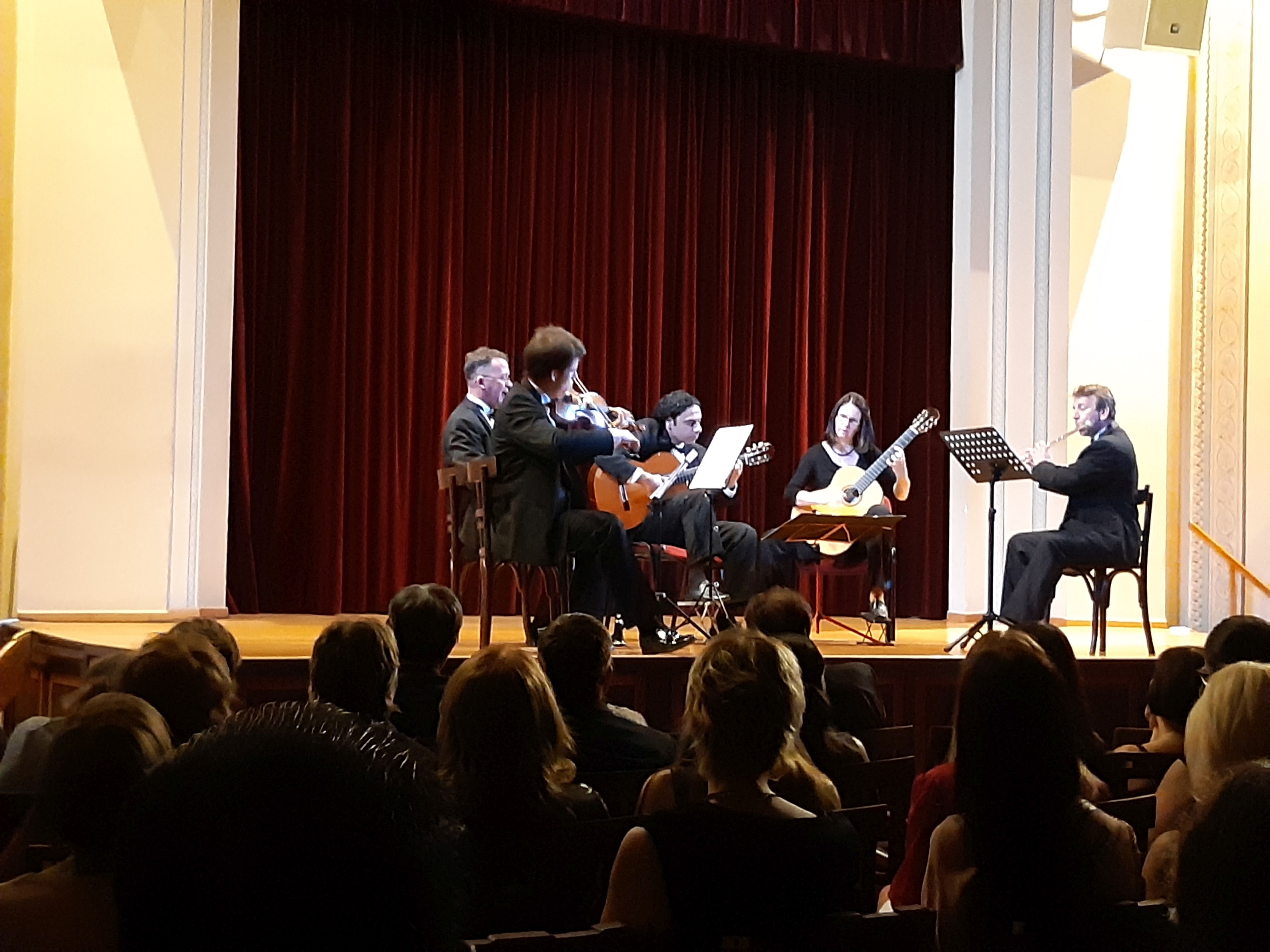 2018. június 11-én V4-es elnökségünk lezárását kamarakoncerttel ünnepeltük meg Athénban. A visegrádi országokkal együttműködve, Nagykövetségünk szervezésében egy-egy cseh, szlovák és lengyel, valamint két magyar zenész közreműködésével az Athén belvárosában található Parnassos Kulturális-és Irodalmi Központban szerveztünk koncertet. A műsort Notis Georgiou ciprusi-magyar versenygyőztes, nemzetközileg népszerű zeneszerző, szólista, karmester állította össze, aki feleségével Márku Zsuzsanna gitárművésszel klasszikus gitáron játszott a zenekarban. Csehországot Jan Mráček hegedűművész, Lengyelországot Aleksander Tesarczyk klarinétművész, Szlovákiát Cyril Šikula fuvolaművész képviselte. A repertoár többek között Notis Georgiou, Debussy, Kovács Béla, Stravinsky, Paganini és Tenidis műveiből állt.